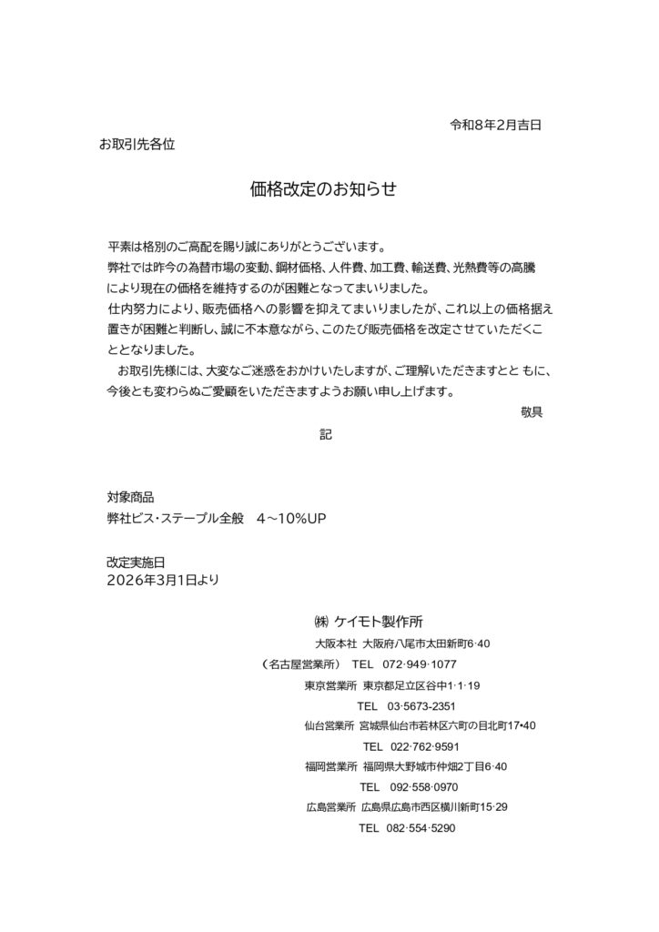 この度、ケイモト製作所のビスに関する価格が改定されることとなりました。