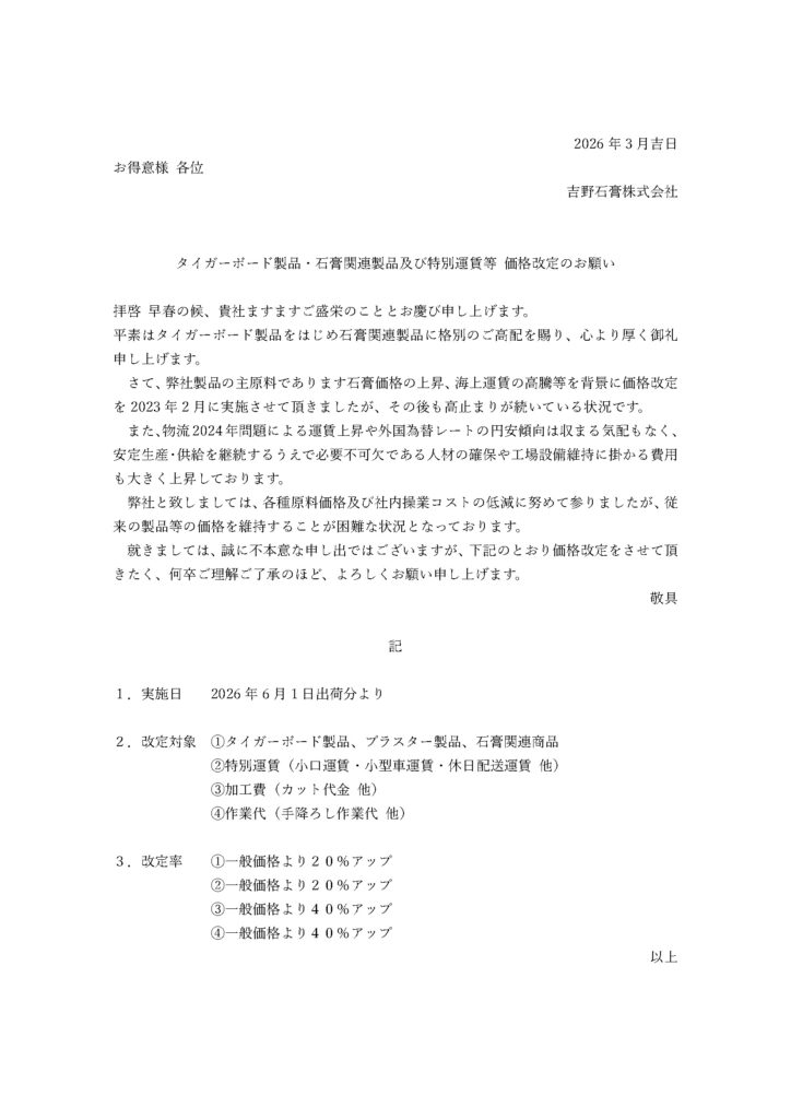 2026.03.19 吉野石膏 価格改定のお知らせ お知らせ Post Share RSS 2026年6月1日出荷分より、吉野石膏株式会社の製品および各種サービスの価格が改定されます。詳細につきましては、下記添付の吉野石膏株式会社からの価格改定のご案内をご確認ください。 Post Share RSS ヒルティ製品の取り寄せ対応しています 前の記事 中東情勢緊迫化に伴う製品への影響について 次の記事